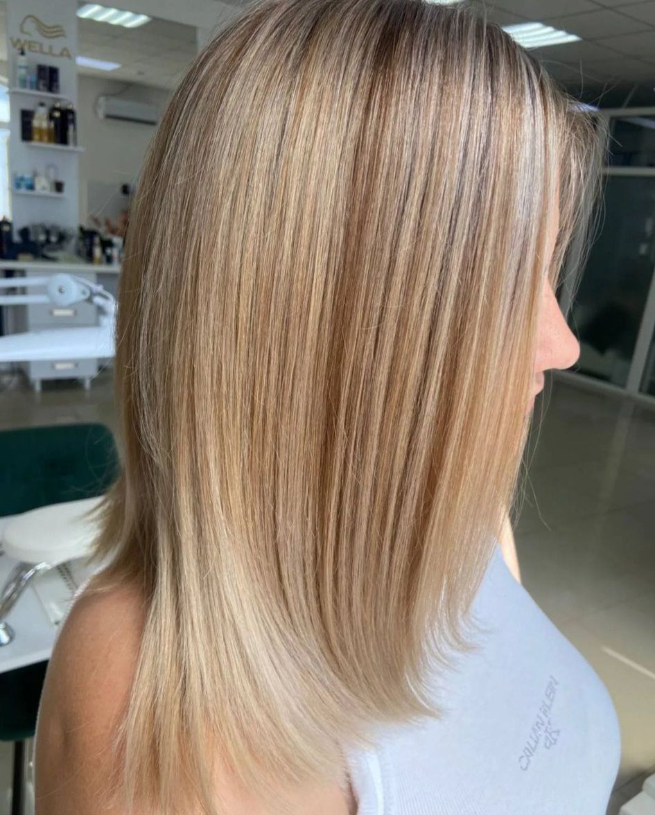 Освітлення та фарбування волосся у блонд для яскравого та рівного кольору.